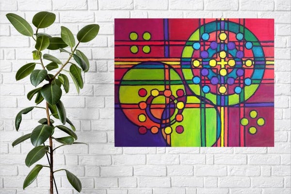 This abstract painting is a hypnotic encounter of color, geometry, and system. Vibrant colors—bright greens, reds, purples, and yellows—are separated by thick, black lines to create a complex, grid-like background. The composition is dominated by two large, intersecting circles, within which a mandala-like pattern of tiny, dot-like circles repeats, as if a visual program code were running on the canvas.